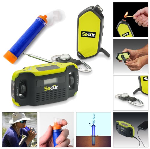 All images of Camping/ Hiking/ Fishing/ Biking/ Hunting Gear Survival Equipment Kit - Includes Hand Crank Dynamo Powered Rainproof 2 & 3 LED Flashlights / fuel less Fire igniter / Compass / whistle / - Digital Solar & Dynamo AM/FM Radio / Alarm Clock / Cell Phone Charger- Jumbl Personal Water Purifier and Filter Straw
